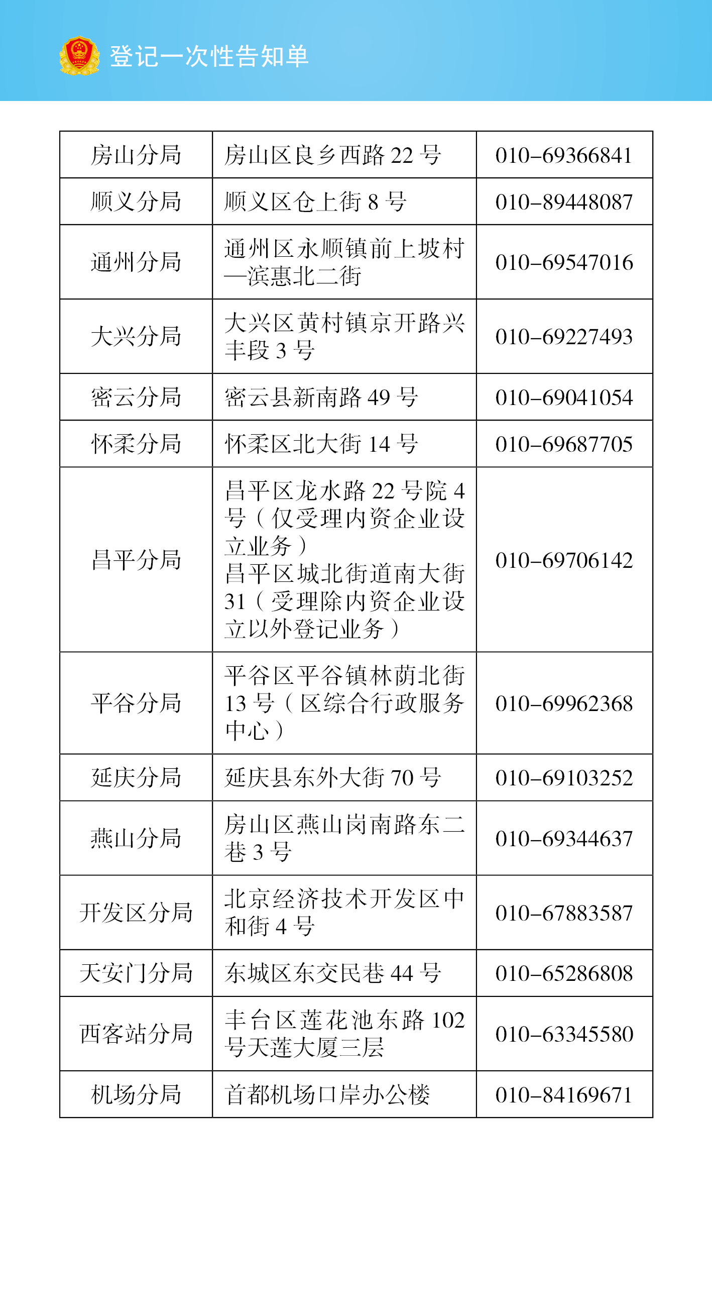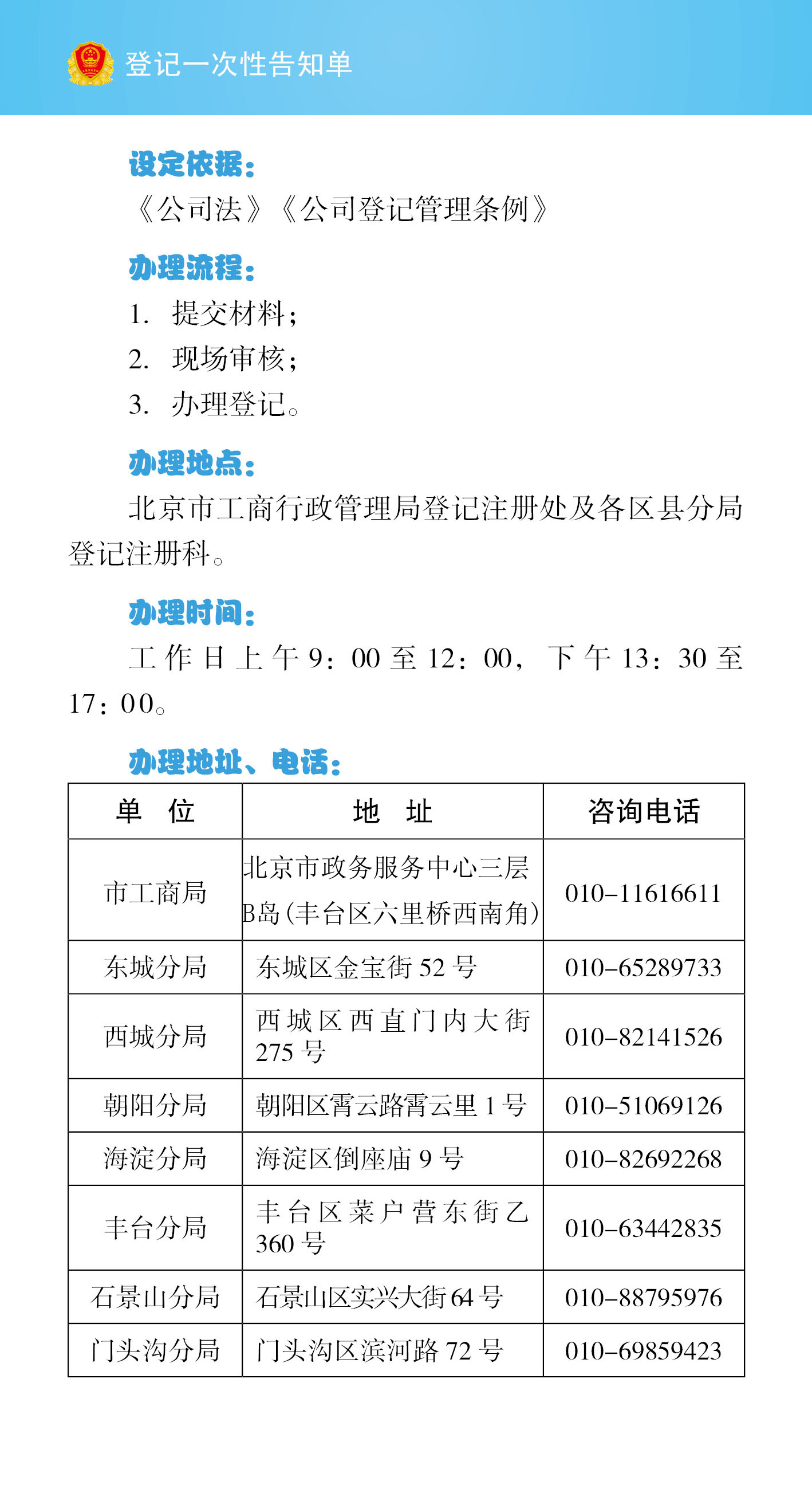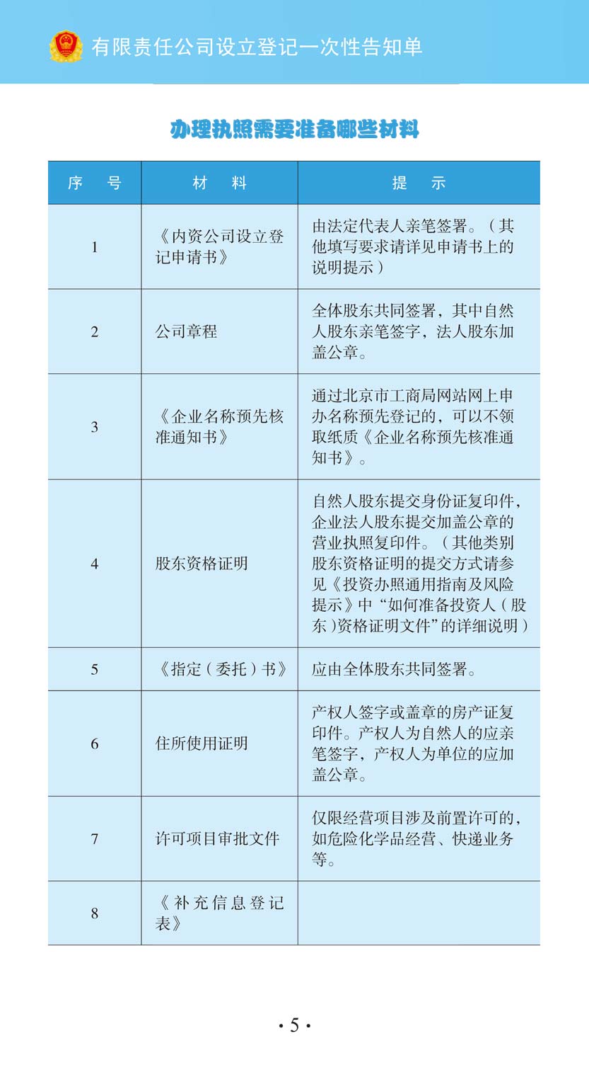 有限責任公司設立登記一次性告知單